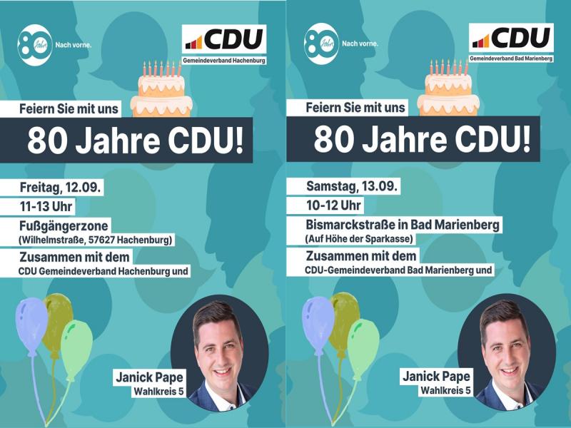 Zum 80-jährigen Bestehen der CDU lädt der CDU-Gemeindeverband Hachenburg am Freitag, 12. September 2025, von 11:00 bis 13:00 Uhr zu einem Infostand beim Wochenmarkt in der Fußgängerzone am Eingang der Wilhelmstraße ein. CDU-Landtagskandidat Janick Pape sowie Vertreterinnen und Vertreter der Christdemokraten stehen für den Dialog bereit.
