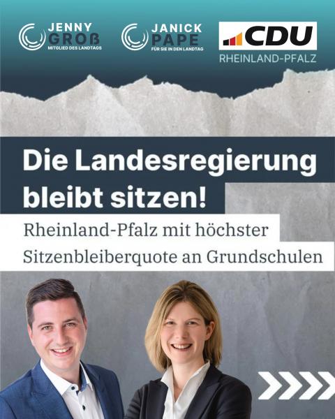 Jenny Groß und Janick Pape, beide CDU-Landtagskandidaten, zur hohen Sitzenbleiberquote an rheinland-pfälzischen Grundschulen: „Wir brauchen eine Grundschul-Garantie, wenn wir unseren Kindern echte Chancen ermöglichen wollen.“