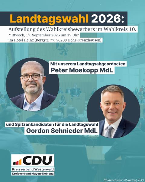 An diesem Abend entscheiden die Mitglieder der CDU aus den Gemeindeverbänden Höhr-Grenzhausen (Westerwaldkreis), Vallendar, Weißenthurm und der Stadt Bendorf (alle im Kreis Mayen-Koblenz), wer bei der Landtagswahl am 22. März 2026 als Direktkandidat ins Rennen geht. Wir freuen uns, dass sich der amtierende Landtagsabgeordnete Peter Moskopp erneut um die Direktkandidatur bewirbt.