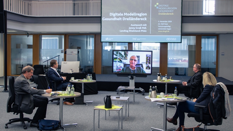 Diskutierten digitale Versorgungskonzepte für den Westerwaldkreis im Forschungskolleg der Universität Siegen: Gerrit Müller (Bürgermeister Verbandsgemeinde Rennerod), Karl-Heinz Boll (Kreistagsmitglied Westerwaldkreis), Jenny Groß (MdL RLP) und Dr. Olaf Gaus (Geschäftsführer FoKoS) v. l. n. r., virtuell hinzugeschaltet Prof. Dr. Christoph Strünck, Prof. Dr. med. Veit Braun und Prof. Dr. Rainer Brück (Dekane und Prodekane der Lebenswissenschaftlichen Fakultät)