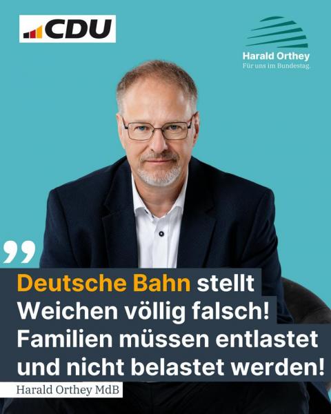 „Die neue Preisstruktur der Deutschen Bahn (DB) sendet ein fatales Signal an Familien: Eine Familie mit zwei Kindern muss künftig statt der bisherigen 10,40 Euro nun 44 Euro für die Hin- und Rückfahrt inklusive Reservierungen zahlen. Dies ist nicht nachvollziehbar und steht in keinem Verhältnis zum bisherigen, familienfreundlichen Ansatz der Bahn,“ so der Wahlkreisabgeordnete Harald Orthey (CDU). Er führt weiter aus: „Im Gegenteil, es ist zu befürchten, dass dies dazu führen wird, dass sich immer weniger Familien für die Bahn entscheiden, was die Schiene als Verkehrsmittel für diese Zielgruppe noch weniger attraktiv macht.“